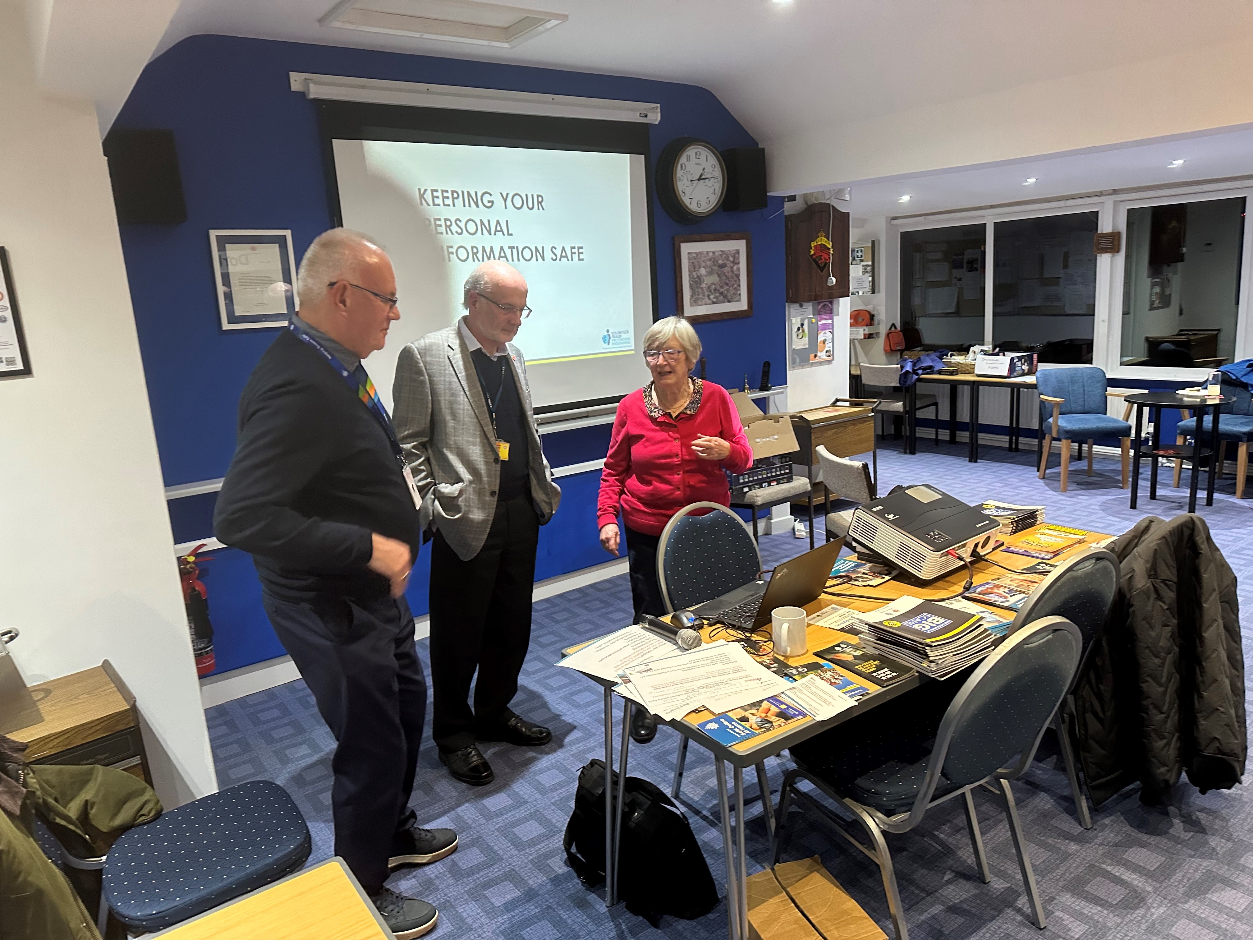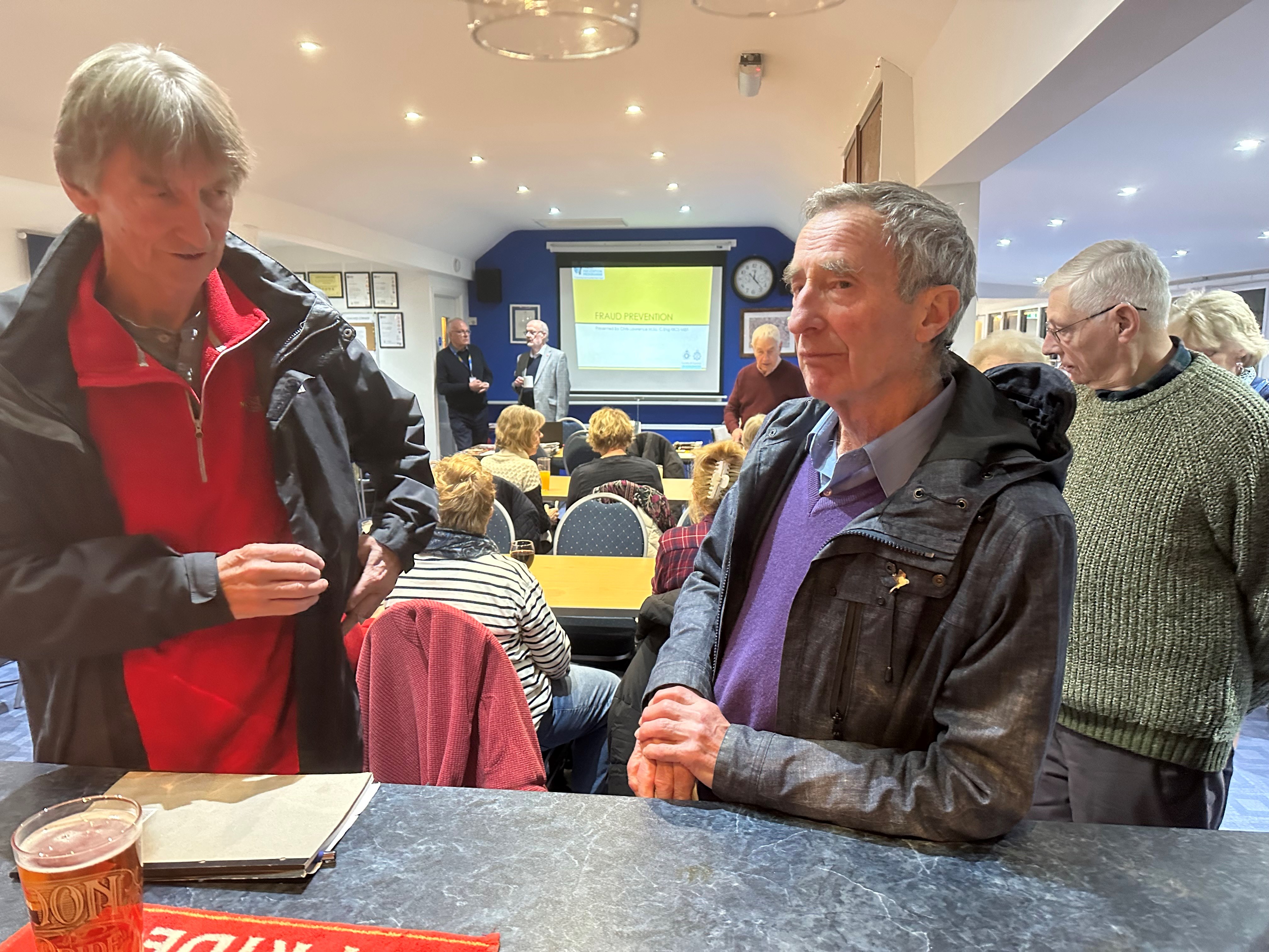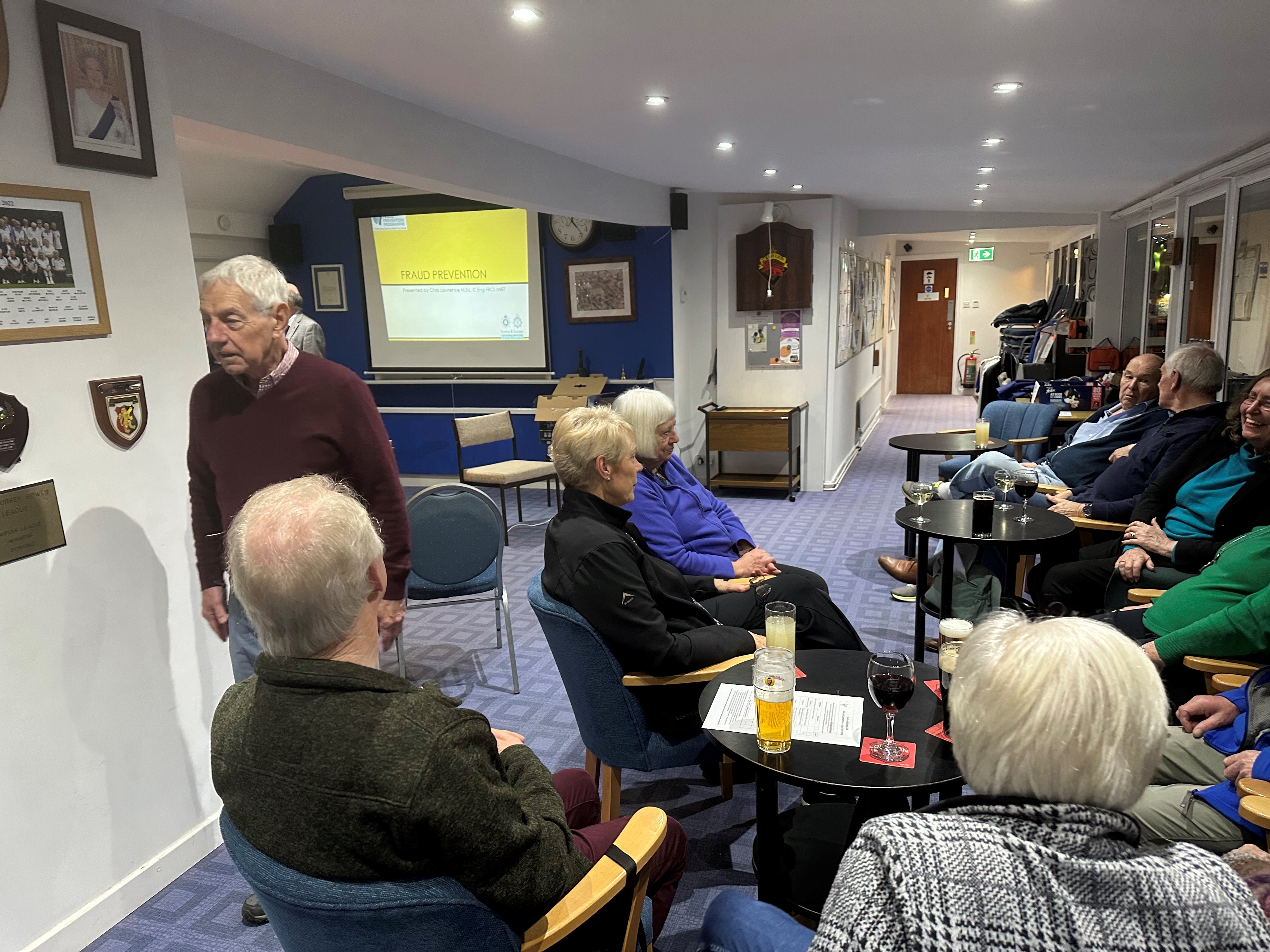 We had two volunteers for Surrey Police give us a very interesting presentation to a good turnout of members on the many different types of Scam that might defraud us - and there are lots. We were also given some sound advice on ways to avoid being scammed and ways to report suspicious communications. I think we all picked up one or two helpful pointers - so a big thank you to Moira. Also thanks to Eric for organising a good spread of sandwiches and running the bar.